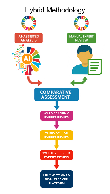 WASD uses VNRs as the main data source for the SDGT. As a self-assessment process, each VNR enables UN Member States to review and report their progress in implementing the 2030 Agenda for Sustainable Development. These reviews are voluntary, inclusive, and country-led, reflecting each nation’s priorities, achievements, and challenges. The analysis of VNRs combines advanced Artificial Intelligence (AI) with rigorous expert evaluation to ensure accuracy, depth, and transparency. AI assisted tools are used to scan, summarise, and structure large volumes of VNR text, enabling efficient processing and identification of key themes. This is followed by manual expert review, where specialists interpret context, verify accuracy, and capture nuanced insights that automated systems may overlook. Comparisons between AI and human assessments are conducted to test reliability, ensuring a balanced, evidence-based evaluation across all SDGs. The process also includes a layered expert review: academic experts from the WASD first assess the SDGT team’s draft, followed by senior WASD experts who provide detailed commentary. A third-opinion review is then undertaken to enhance objectivity, and country-specific experts validate local accuracy and relevance. Where data gaps or inconsistencies exist, WASD uses proxy indicators or qualitative assessments, ensuring that all 17 SDGs are systematically evaluated. This approach transforms the VNR findings into a standardised performance framework, allowing for consistent and transparent measurement of sustainability across nations. In the final stage, the refined analysis is uploaded to the SDGT platform, ensuring full transparency and enabling public feedback for continuous improvement. In doing so, we aim at determining the country’s efficacy and progress of achieving the SDGs by allocating the score from 0-5 for each SDG as follows: